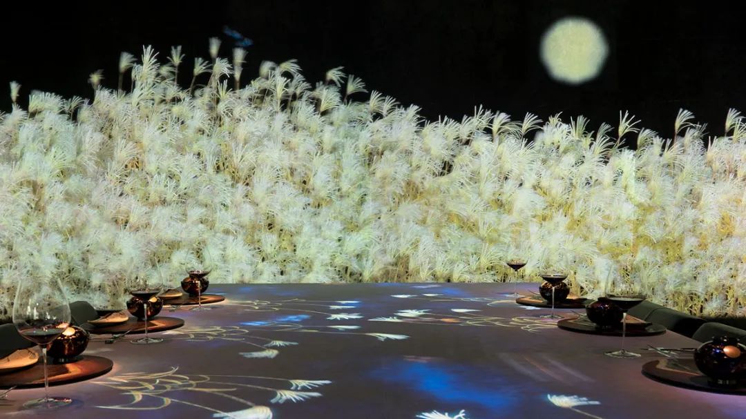 "MoonFlower Sagaya Ginza Art by teamLab”是日本高档和牛餐厅Sagaya银座与艺术团体teamLab合作设计的一个沉浸式互动餐厅。整个空间将优雅的美食和食器与实时投影相结合,为用餐者提供多重感官的用餐体验。