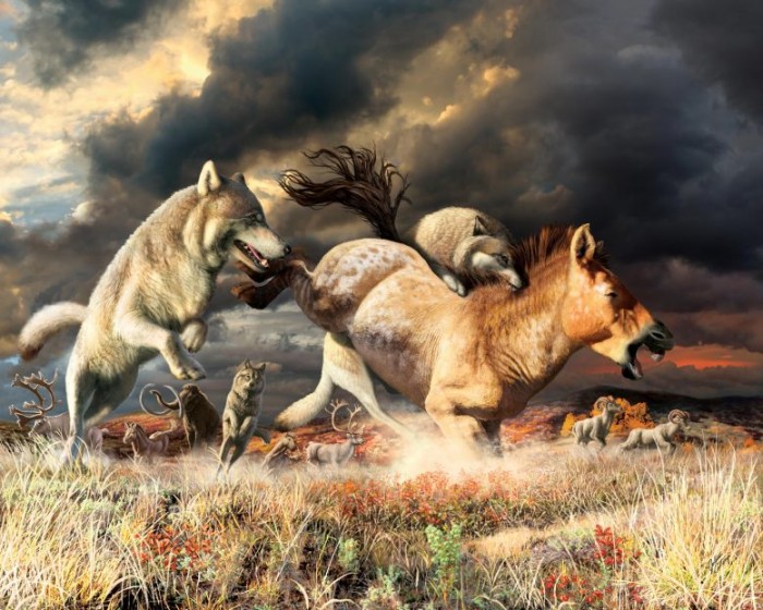 结果显示,在更新世期间灭绝的马,占灰狼饮食的一半左右。约15%来自驯鹿和达尔羊,还有一些猛犸象混杂其中。所有这一切都发生在古代灰狼会与其他大型食肉动物共存的时候。这些食肉动物的最终灭绝,可以为狼群创造更多的机会,让它们过渡到新的猎物种类。