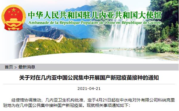 当地时间4月21日,中国驻几内亚使馆发布关于在几内亚中国公民接种新冠疫苗的通知。