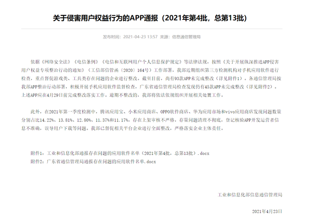 依据《网络安全法》《电信条例》《电信和互联网用户个人信息保护规定》等法律法规,按照《关于开展纵深推进 App 侵害用户权益专项整治行动的通知》(工信部信管函〔2020〕164 号)工作部署,我部近期组织第三方检测机构对手机应用软件进行检查,重点督促游戏类、工具类存在问题的企业进行整改。截至目前,尚有 93 款 App 未完成整改。各通信管理局按我部 App 整治行动部署,积极开展手机应用软件监督检查,广东省通信管理局检查发现仍有 45 款 App 未完成整改。上述 App 应在 4 月 29 日前完成整改落实工作。逾期不整改的,我部将依法依规组织开展相关处置工作。