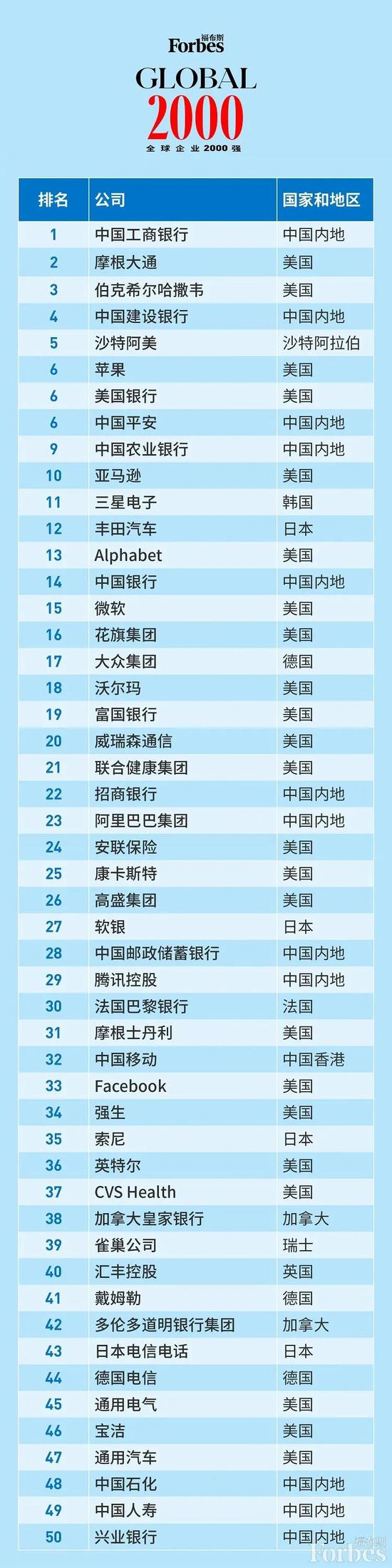 今日,福布斯发布第19期福布斯全球企业2000强( Global 2000)。榜单依据销售额、利润、资产、市值这四大衡量标准,每年评选出全球最大、市值最高的2000家上市公司。