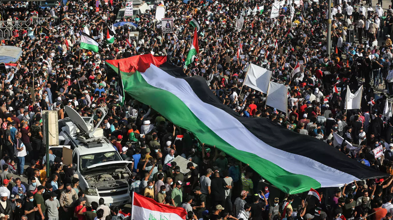 本轮巴以冲突爆发以来,伊拉克民众在各地组织了多次游行示威活动,对巴勒斯坦进行声援。近日,在首都巴格达,成千上万名伊拉克民众聚集在市中心的解放广场,抗议以色列对巴勒斯坦被占领土发动的袭击。