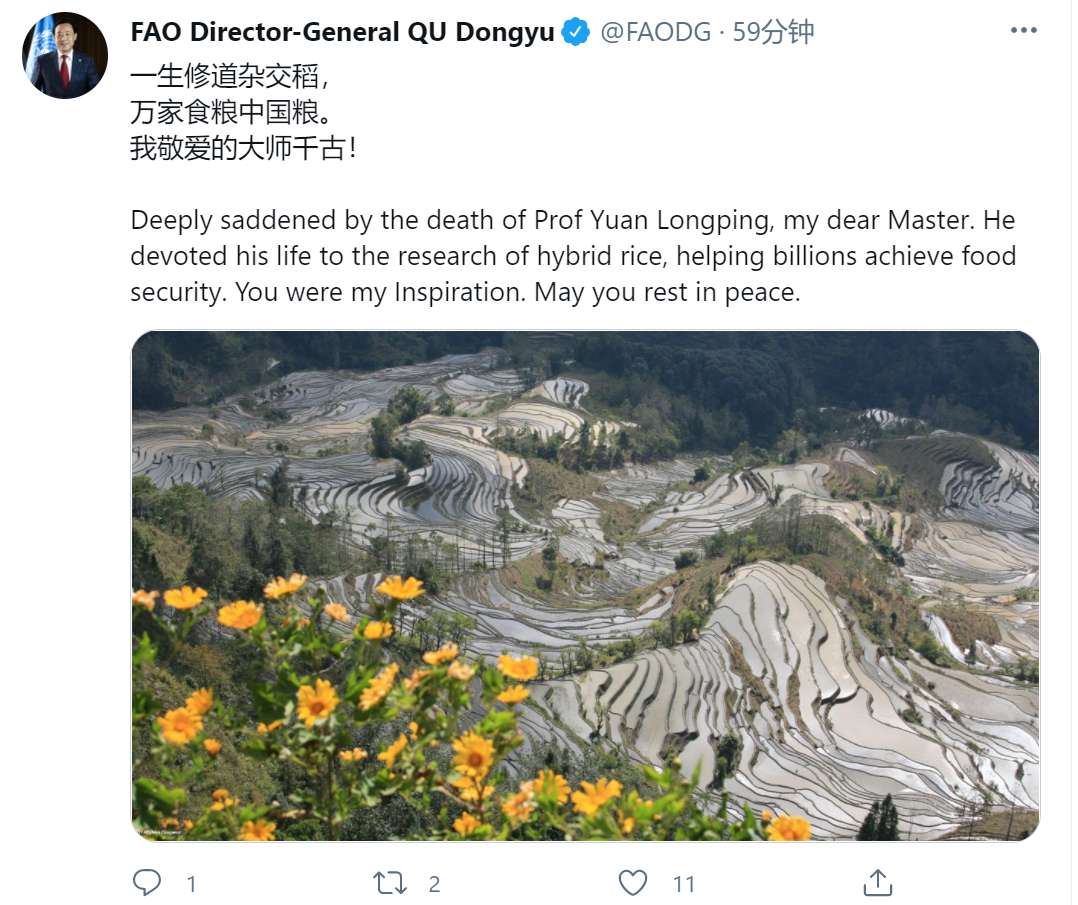 联合国粮农组织总干事悼念袁隆平院士:我敬爱的大师千古!