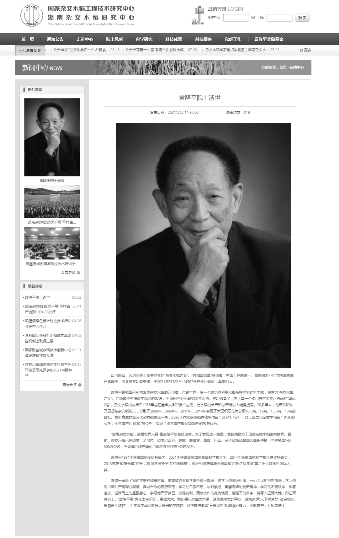 22日,袁隆平任职的国家杂交水稻工程技术研究中心暨湖南杂交水稻研究中心发文悼念。