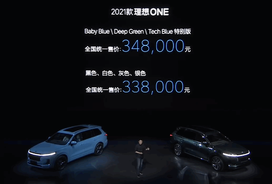 5月25日,2021款理想ONE正式上市,与苹果的“爆款打天下”的理念类似,新款理想ONE仍然只有一款车型,售价为33.8万元。而选装Baby Blue/Deep Green/Tech Blue三款特别版颜色的车型,需要加价1万元,售价34.8万元。