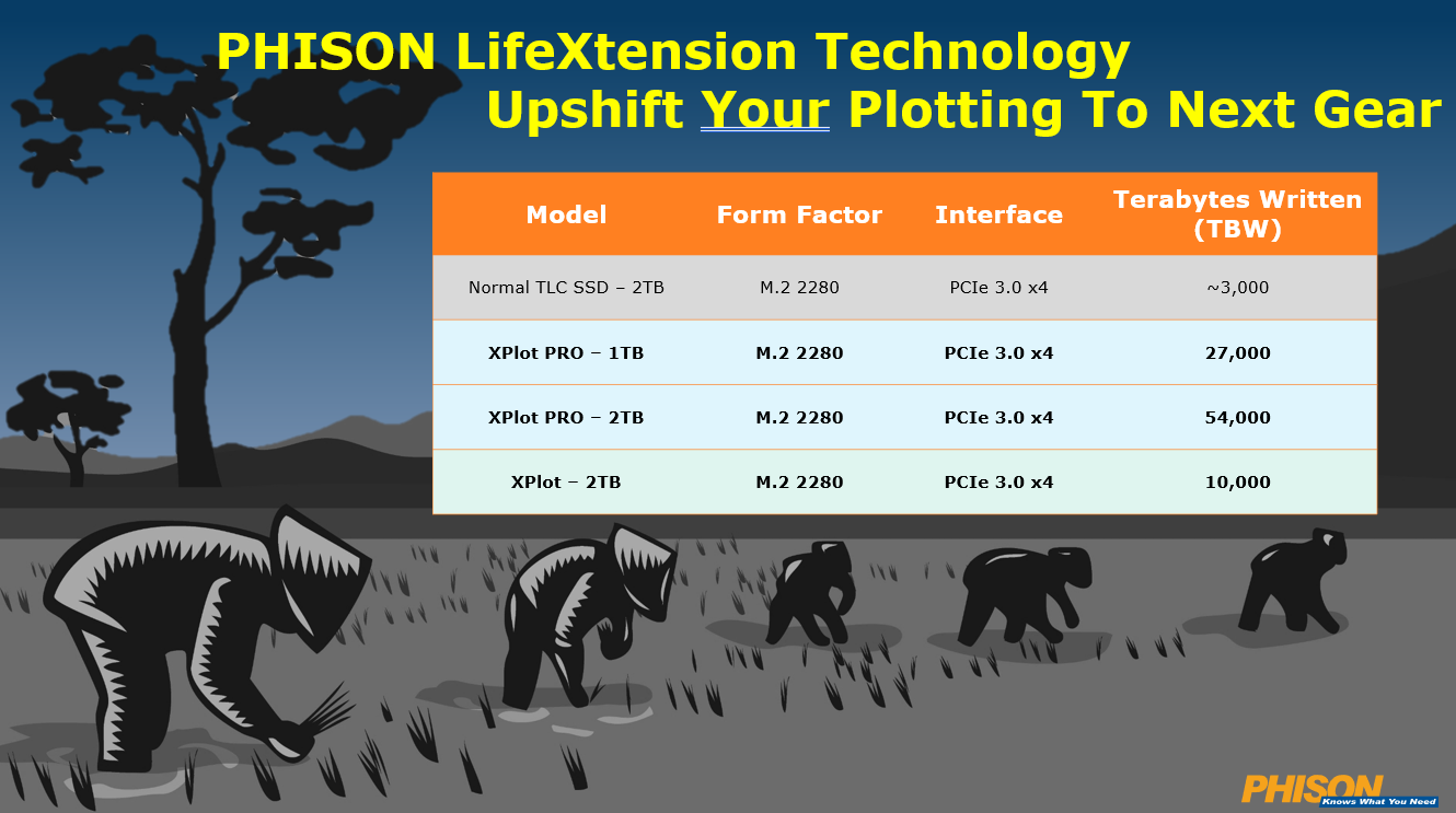 该系列 SSD 均采用 M.2 2280 规格,PCIe 3.0×4 通道。官方表示,通过群联独家的 LifeXtension 技术,最高能有效延长 SSD 使用寿命达 18 倍。图中可以看出,传统 2TB 容量 TLC SSD 的寿命约为 3000TBW(寿命期 3000TB 的写入),而新产品同样为 2TB 容量,但是寿命最低可达 10000TBW,旗舰型号 XPlot PRO 的寿命可达 54000TBW。