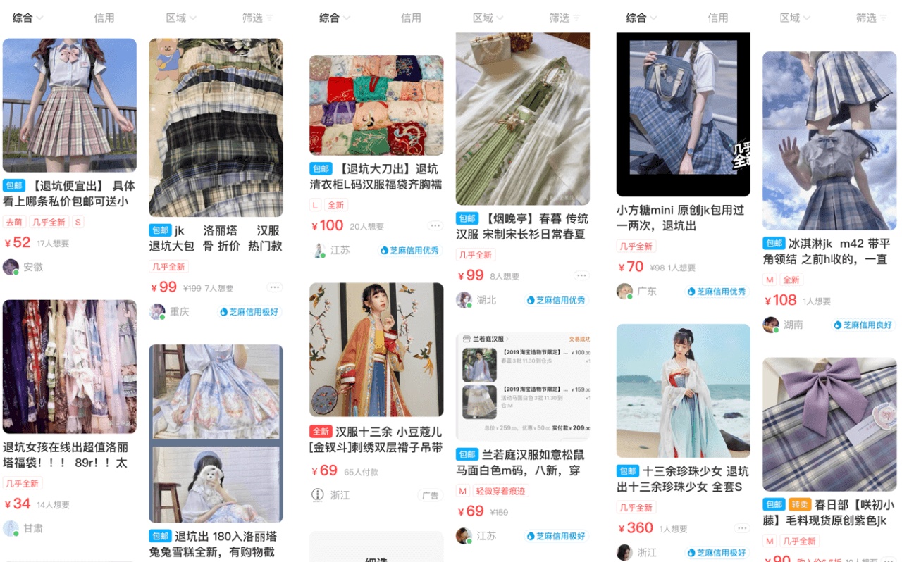 不仅仅是汉服,曾被誉为破产三姐妹的JK制服和洛丽塔小裙子们,在海鲜市场的行情亦是如此。