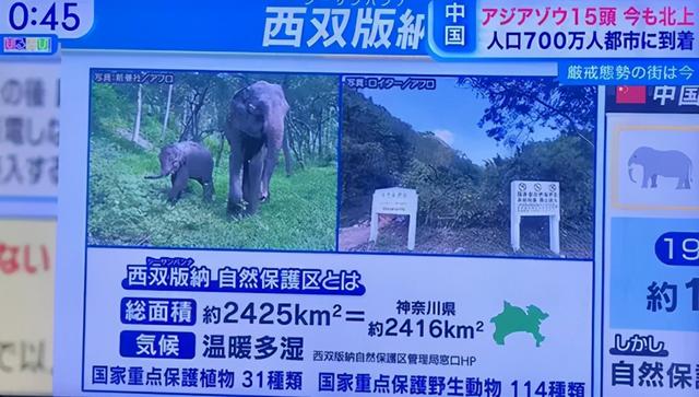 “中国的自然保护区用于保护珍稀动植物的生活栖息” ,TBS在3日的节目介绍道:西双版纳自然保护区气候温暖潮湿,面积为2425平方千米,比日本的神奈川县还要大(注:县是日本行政单位,类似于中国的“省”),在此栖息着114种国家重点保护野生动物。