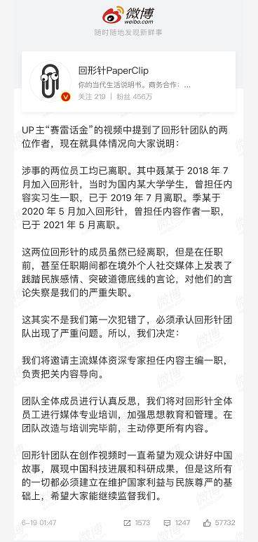 这两位回形针的成员虽然已经离职,但是在任职前,甚至任职期间都在境外个人社交媒体上发表了践踏民族感情、突破道德底线的言论,对他们的言论失察是我们的严重失职。