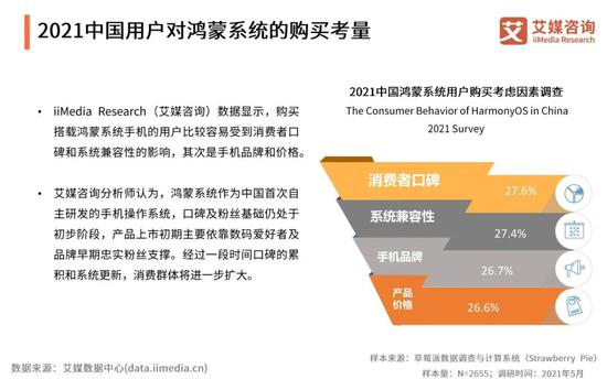 此前,艾媒咨询发布的《2021年鸿蒙系统市场竞争力状况与消费者行为调研报告》披露,购买搭载鸿蒙系统手机的用户比较容易受到消费者口碑和系统兼容性的影响,其次是手机品牌和价格。艾媒咨询分析师认为,经过一段时间口碑的累积和系统更新,其消费群体将进一步扩大。而鸿蒙系统快速推广的核心因素是构建了可盈利的、繁荣的生态圈。