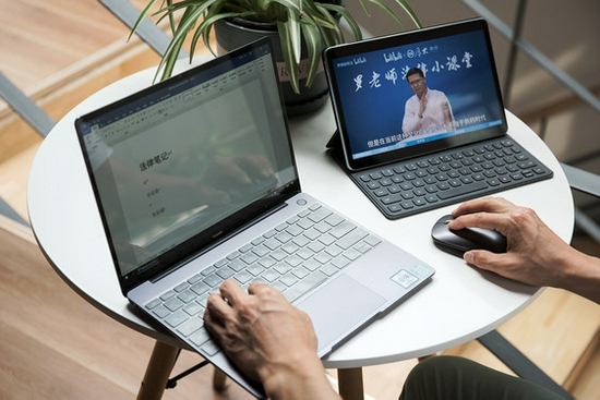 当我们把华为Mate Pad 11通过智能终端与华为笔记本电脑协同,连接成功后有镜像、扩展和共享三个模式。此时的华为Mate Pad 11就相当于我们笔记本的第二块屏幕。以扩展模式为例,当我们利用华为Mate Pad 11在线学习网课内容时,笔记本电脑就可以同步去记笔记或者撰写文稿,这样一来就大大提高了我们的学习效率。