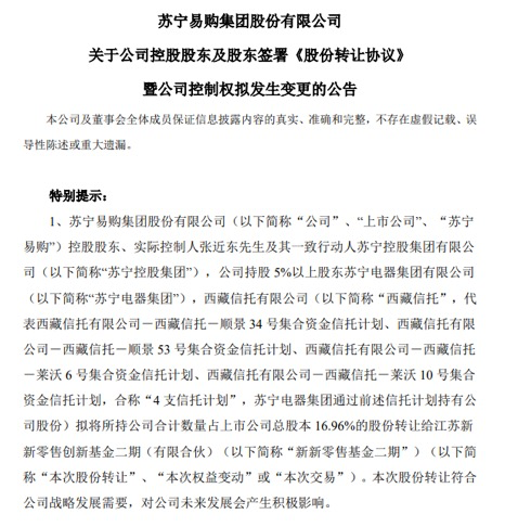 7月5日的公告显示,驰援苏宁易购的“白衣骑士”从深国资变成了江苏国资,战投名单“刷新”了。根据公告,张近东及其一致行动人苏宁控股集团、股东苏宁电器集团拟将上市公司16.96%的股份转让给江苏新新零售创新基金二期(有限合伙),转让价格为5.59元/股。