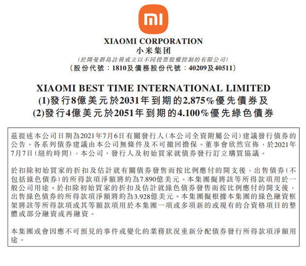 新浪科技讯 7月8日早间消息,小米集团发布公告称小米公司全资附属公司发行8亿美元于2031年到期的2.875%优先债券,发行4亿美元于2051年到期的4.100%优先绿色债券。