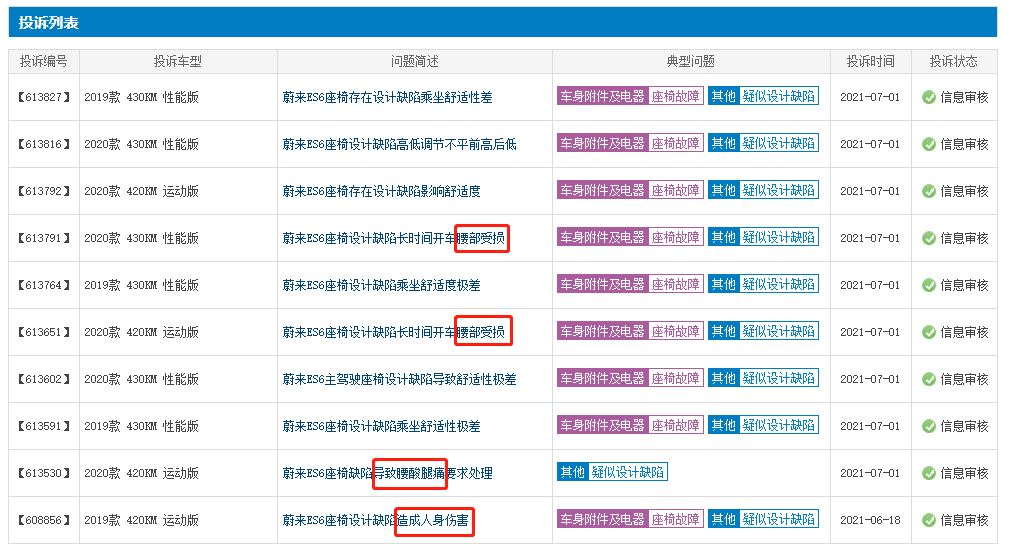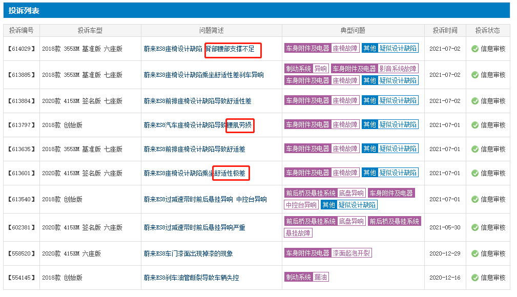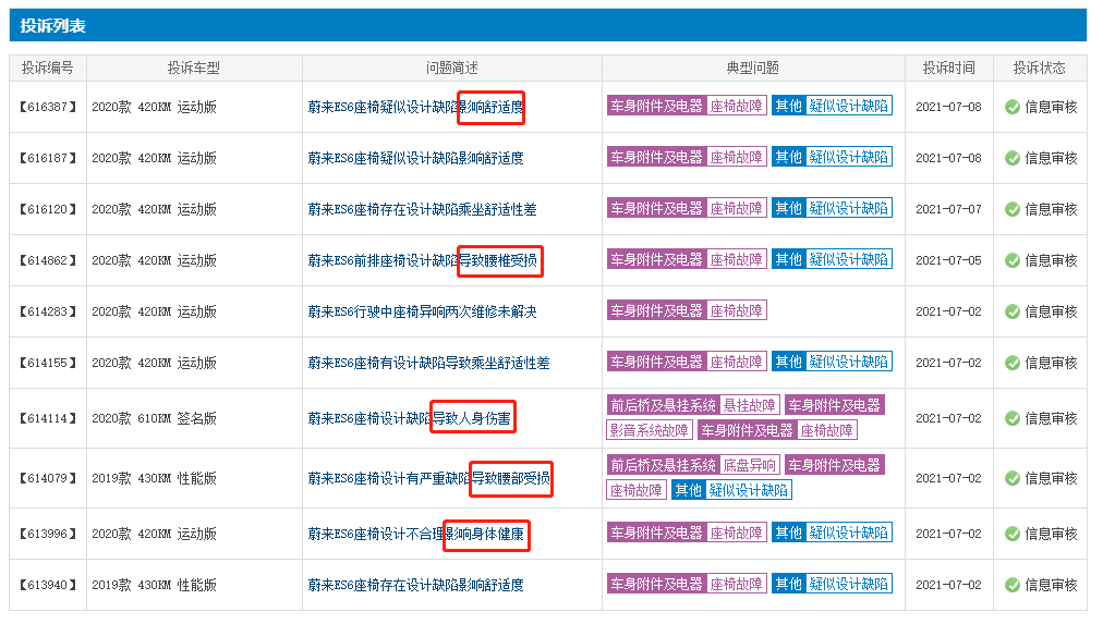 DoNews7月9日(卢逸恺)日前,据DoNews汽车从汽车投诉平台车质网了解到,蔚来被大量车主投诉涉及存在座椅设计缺陷。涵盖蔚来旗下ES8、ES6和EC6三款已上市的全部车型,可谓是一时激起千层浪。