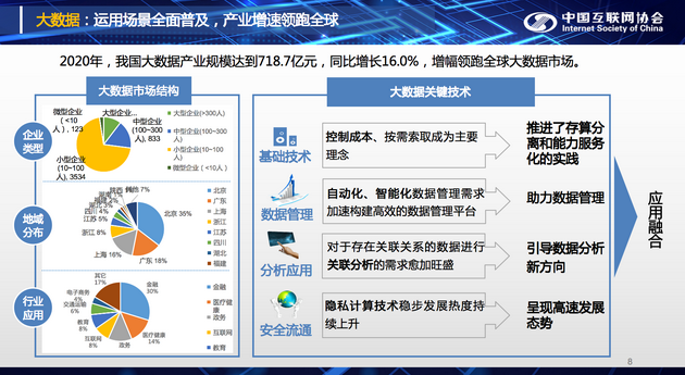 新浪科技讯 7月13日上午消息,《中国互联网发展报告(2021)》今日于中国互联网大会上正式发布。报告显示,2020年我国大数据产业规模达到718.7亿元,同比增长16.0%,增幅领跑全球大数据市场。