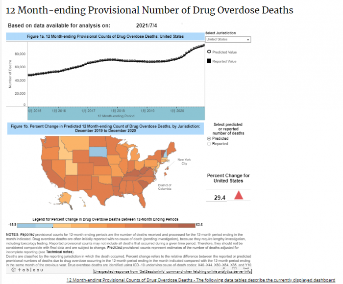 在2020年12月发布的健康警报中,CDC在截至2020年5月的12个月期间药物过量死亡情况恶化后敲响了警钟,这是 "有史以来12个月期间药物过量的最大数量"。医学杂志《美国医学会杂志》报道,吸毒过量死亡的最大增幅是在2020年3月至2020年5月--美国新冠封锁期的开始。