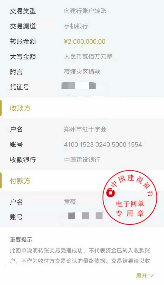 新浪科技讯 7月21日下午消息,主播薇娅向郑州市红十字会捐款200万元。