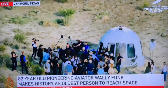 带着地球人的“反向祝福”,贝索斯辞掉了亚马逊CEO的职位,在7月20日(阿波罗11号成功登月的纪念日),和弟弟马克、82岁的沃利·芬克、18岁的奥利弗一起飞向了太空。四人经过11分钟的旅行后,在得克萨市州的西部沙漠安全着陆。