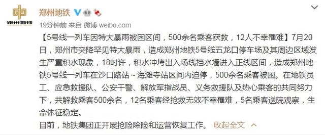 据郑州市轨道交通有限公司运营分公司官方微博@郑州地铁通报,5号线一列车因特大暴雨被困区间,500余名乘客获救,12人不幸罹难。通报指出,7月20日,郑州市突降罕见特大暴雨,造成郑州地铁5号线五龙口停车场及其周边区域发生严重积水现象,18时许,积水冲垮出入场线挡水墙进入正线区间,造成郑州地铁5号线一列车在沙口路站~海滩寺站区间内迫停,500余名乘客被困。