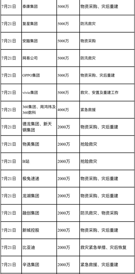 7月21日,小米公益基金会紧急宣布捐款5000万元,用于保障当地群众的人身安全、采购紧急救灾物资和灾后重建工作。