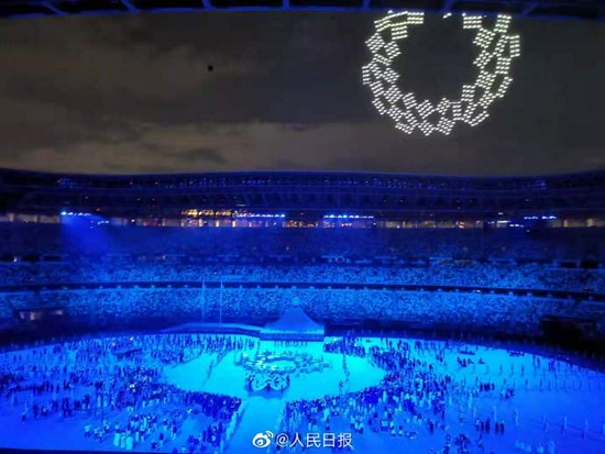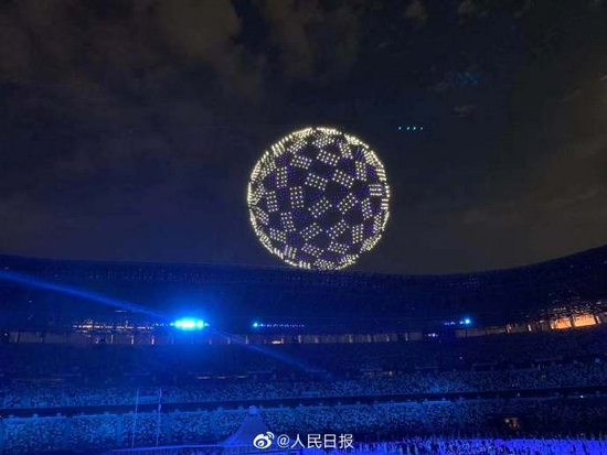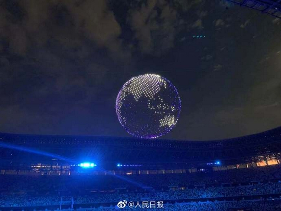 体育场上方的夜空当中,1824架无人机组成一个东京奥运会的会徽,与场内的会徽遥相呼应。会徽在夜空中旋转变化,逐渐形成一个蓝色的球形,就是我们生活的地球。