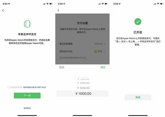 在手机微信上同意《微信智能设备支付用户协议》,设置每日限额、支付方式,并输入支付密码确认,就可以开启手表支付功能了。微信支付支持最高每日 1000 元人民币的支付限额。