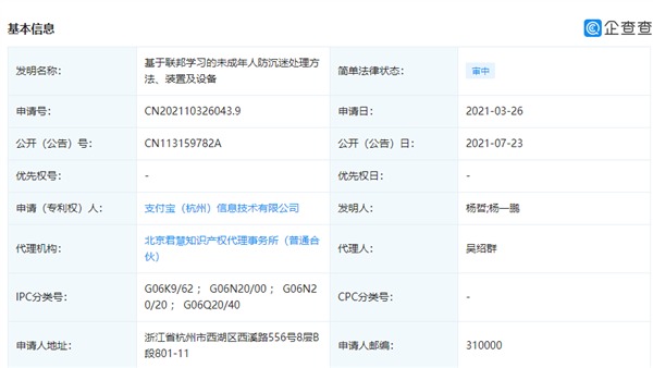 企查查App显示,7月23日,支付宝(杭州)信息技术有限公司公开“基于联邦学习的未成年人防沉迷处理方法、装置及设备”专利,公开号为CN113159782A。