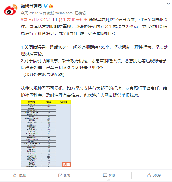 8月1日晚,微博官方发布公告称,@平安北京朝阳 通报吴亦凡涉案信息以来,微博站方对此非常重视,以维护好站内社区生态秩序为落点,立即对相关信息进行了排查治理。