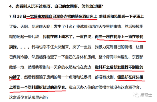 黑奇士对警方发布的通告和被侵害女员工发布的帖子进行交叉对比分析后发现,至少有五处细节描述与警方通告不符,列举如下: