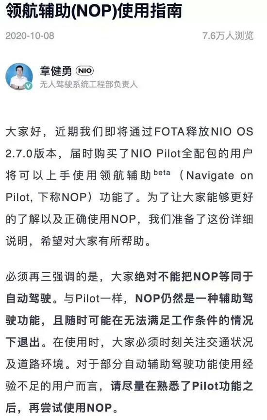在社交媒体上,不少网友将本次事故的原因归结于蔚来自动驾驶系统,但也有人指出,蔚来方面曾多次声明,领航辅助(NOP)不等于自动驾驶。