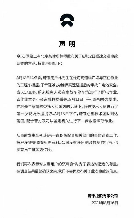 8月16日晚,@蔚来微博发布声明称,网络上有北京某律所律师散布关于8月12日福建交通事故调查的言论,特此声明如下: