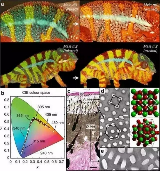 绿色的变色龙,是体表细胞含绿色色素吗?|d.teil/flickr那它们是怎么呈现出绿色的体色呢?研究者Milinkovitch教授以及他的日内瓦大学同事通过对豹变色龙的一系列研究,还原了变色真相——变色龙体表的色素细胞之下还有一层虹细胞,虹细胞中含有排列成三角形栅格状的纳米级晶体,而这种晶体才是变色的关键因素。