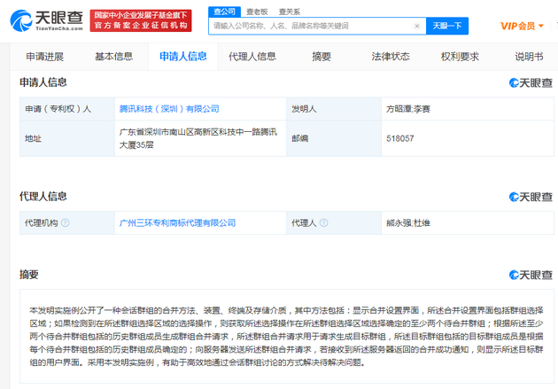 新浪科技讯 8月24日下午消息,天眼查App显示,8月24日,腾讯科技(深圳)有限公司获得“会话群组的合并方法、装置、终端及存储介质”专利授权,公告号CN111277637B,申请日期为2020年1月。