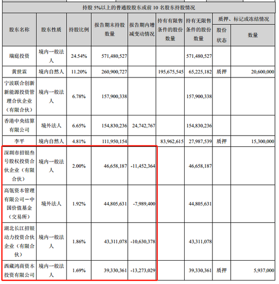 2021年半年度报告显示,宁德时代十大股东中有4家减仓,其中深圳市招银叁号股权投资合伙企业减持1145.23万股,持股比例从2.49%减至2%;高瓴资本管理有限公司-中国价值基金(交易所)减持798.94万股,持股比例由2.27%降至1.92%;湖北长江招银动力投资合伙企业减持1063.03万股,持股比例从2.32%降至1.86%。不过,香港中央结算有限公司持股比例小幅上升,由一季度的6.53%上升到6.65%。