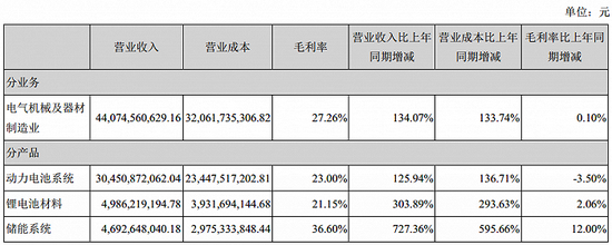 报告期内,受新能源车市场需求拉动,宁德时代动力电池系统销售收入为304.51亿元,同比增长125.94%;同时,公司实现储能系统销售收入46.93亿元,同比增长727.36%;此外,受下游锂电池需求拉动,公司锂电池材料销售收入为49.86亿元,同比增长303.89%。