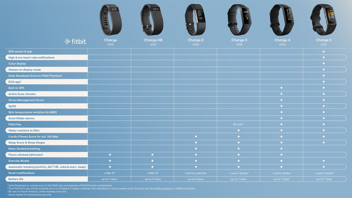 此外,手环还支持 Fitbit Pay 支付功能,并与安卓快速绑定,同时兼容苹果 iOS 设备。以下为 Charge 5 手环与前几代的对比: