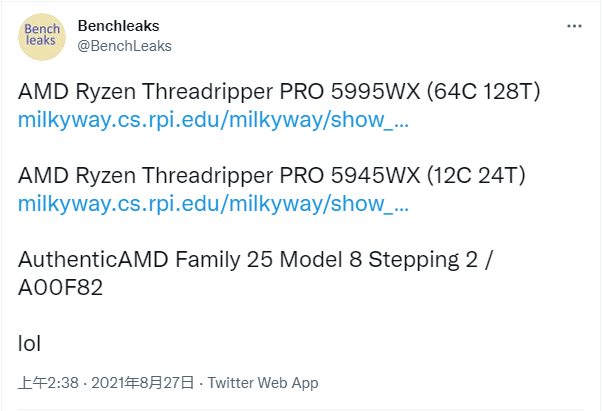 基于 Zen 3 架构的 AMD 锐龙(Ryzen)线程撕裂者(Threadripper PRO)5995WX / 5945WX 工作站处理器,已经被 MilkyWay@Home 曝光。作为一个个分布式计算平台,后者致力于创建银河系的 3D 模型。不过作为线程撕裂者“WX”家族的一员,网站上并未披露该系列 Zen 3“Chagall”处理器的时钟频率、L3 缓存大小、以及 TDP 功耗等关键规格。