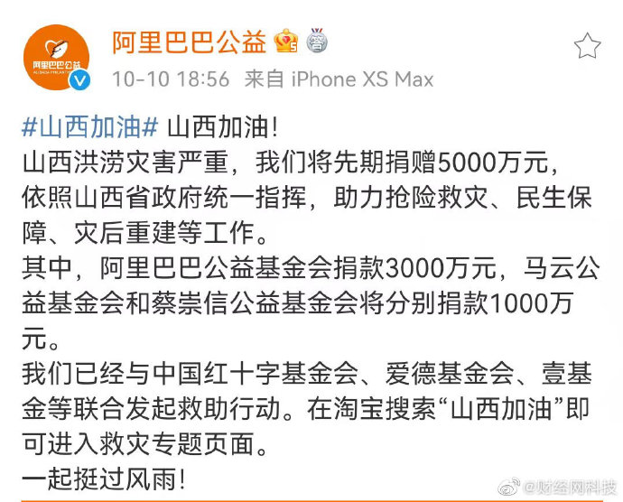 【#阿里巴巴公益宣布捐赠5000万元驰援山西#】山西洪涝灾害严重,阿里巴巴公益宣布将先期捐赠5000万元,依照山西省政府统一指挥,助力抢险救灾、民生保障、灾后重建等工作。其中,阿里巴巴公益基金会捐款3000万元,马云公益基金会和蔡崇信公益基金会将分别捐赠1000万元。