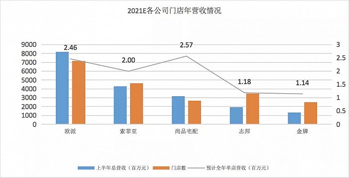 通过2021H1各公司的营收/门店数大致估算单个门店的年营收,单店收入最高的是尚品宅配的257万元(与铺购物中心渠道有关系),略微超过龙头欧派的门店营收,索菲亚平均单店收入200万元,志邦和金牌则不到120万元。注意:这仅仅是在总量层面观察,目前一二线城市的单店收入基本超过200万元,头部公司的门店能够迈入300万元,志邦和金牌的平均单店收入小是因为大比例的下沉市场门店比例。