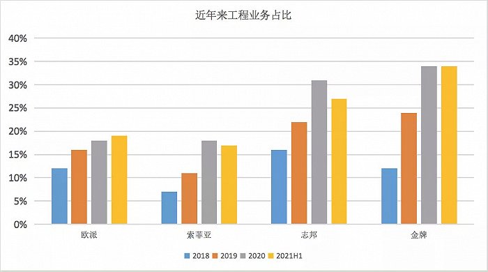 明显地,欧派的工程业务的特点是求稳,包括索菲亚在内的追赶者已经把工程渠道作为“弯道超车”的渠道策略,他们的业务增长要明显高于欧派,其中金牌和志邦在近两年的工程业务占比基本已经实现30%的“532渠道”结构,可见精装修业务已成为志邦和金牌的主要增长引擎。
