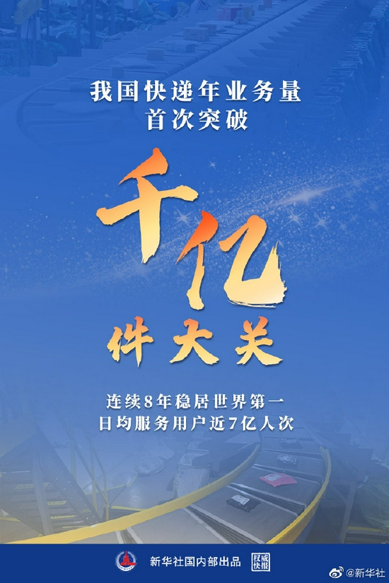 12月8日,国家邮政局快递大数据平台实时监测数据显示,2021年我国快递业务量已达1000亿件,这是我国快递年业务量首次突破千亿级别,已连续8年稳居世界第一,日均服务用户近7亿人次。