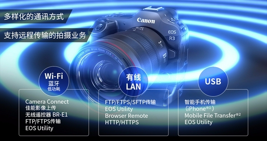 而在网络功能方面,EOS R3支持有线及无线等多种网络连接方式,可满足奋战在新闻报道、野外拍摄以及棚拍等一线专业摄影师不同的传输需求。EOS R3内置2.4GHz/5GHz频段的Wi-Fi通讯功能,支持IEEE 802.11b/g/n/a/ac的规格。除了可通过智能手机应用程序Canon Camera Connect连接智能手机进行图像传输,还支持FTP等业务级图像传输。在EOS R 相机系列中首次支持1000BASE-T以太网端子,可实现高速有线传输。通过USB Type-C 端子(USB 3.2 Gen 2)可连接FTP,或通过EOS Utility 实现文件高速传输及遥控拍摄。