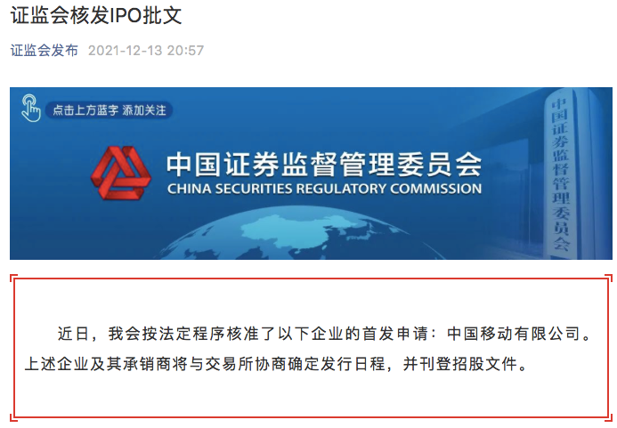 C114讯 12月13日消息(乐思)今日晚间,证监会披露消息显示,按法定程序核准了中国移动有限公司(以下简称“中国移动”)的首发申请,该企业及其承销商将与交易所协商确定发行日程,并刊登招股文件。