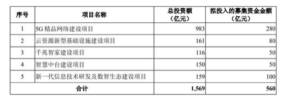 根据此前发布的公告,中国移动本次募集资金投资项目聚焦其主营业务,包括5G精品网络建设项目、云资源新型基础设施建设项目、千兆智家建设项目、智慧中台建设项目、新一代信息技术研发及数智生态建设项目。其中,拟投入的5G精品网络建设项目的募集资金金额达到280亿元,占到了此次募集资金总额的一半。