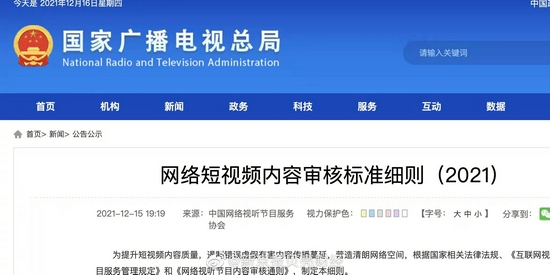 12月15日晚,国家广播电视总局官网也发布了《网络短视频内容审核标准细则(2021)》。