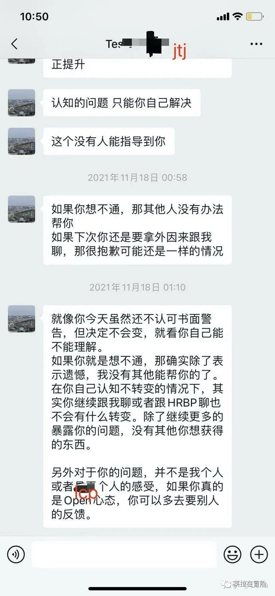 问到蒋和陆为什么不进行调查后再给我结论。对于我的问询蒋回应:“公司没有必要向你解释也没有必要向你汇报,我们今天只处理你。至于为什么不处理别的同事呢?你需要反思一下。”