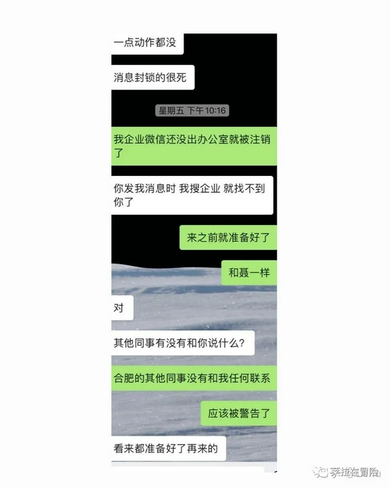 沈某和我被带到了肥东县经济开发区派出所。在此期间,HRBP仍要求我交出工作手机,被我拒绝。蒋、陆二人此时竟然冲进民警办公室说我在公司群发布不实言论,要求没收我的手机。同时安排公司同事踢我出所有工作群,并要求同事远离我,保护好自己。了解情况的民警对没有理会他们的无理要求,并让他们立刻出办公室,回头和我说抓紧处理好信息。