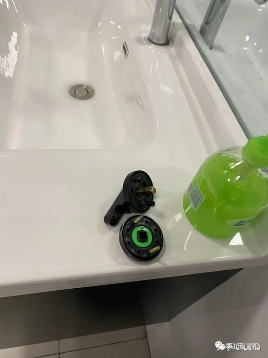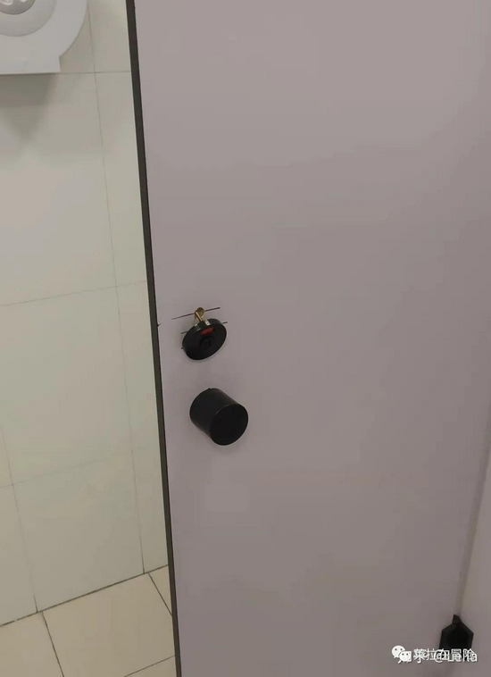 洗手间的门来不及反锁,我只好用身体强抵着,我害怕的一直哭。陆蒋二人冲撞洗手间门直击到我的头都不罢休。没能抵住,只好弃门逃跑向隔间反锁保护自己。蒋徒手拉着门板上端往外拽,反锁的扣件拉到变形后,看到我 抓着我的手就往外拖。逼到门后一把夺过我的手机,这才暂停暴力。陆在外面说到:“抢错了,是另外一个手机。”