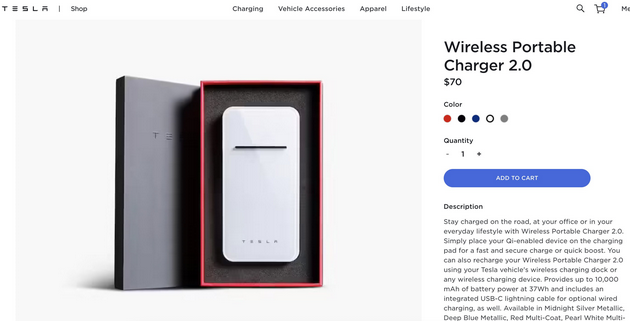 据官网描述,该无线充电宝配有红、黑、蓝、白、灰5种颜色,对应特斯拉5种车漆颜色;容量为10000毫安,支持所有Qi协议的设备无线充电,也可以通过Type-C接口有线充电。