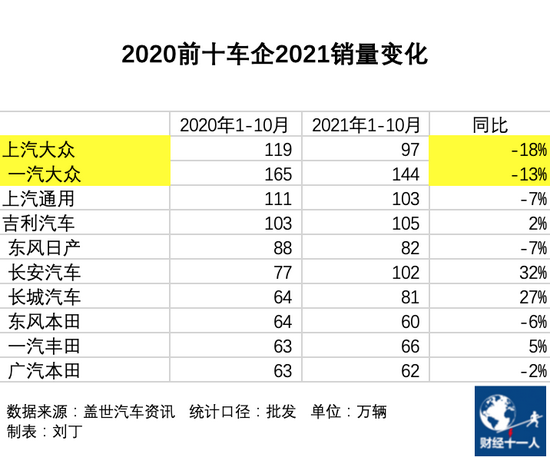 2021年,中国市场的前十大车企中,上汽大众和一汽大众的销量下滑最剧,分别下降了18%和13%。